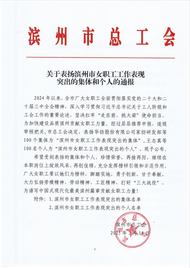 近日,滨州市总工会公布《关于表扬滨州市女职工工作表现突出的集体和个人的通报》文件,家纺研发部凭借卓越的工作表现和突出贡献,荣获“滨州市女职工工作表现突出的集体”荣誉称号。